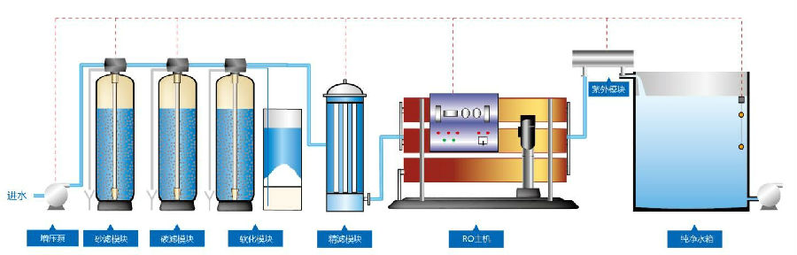 增壓泵→多介質(zhì)過(guò)濾→果殼活性炭過(guò)濾器→軟化過(guò)濾→精密過(guò)濾→RO主機(jī)→紫外線(xiàn)殺菌裝置→不銹鋼水箱
